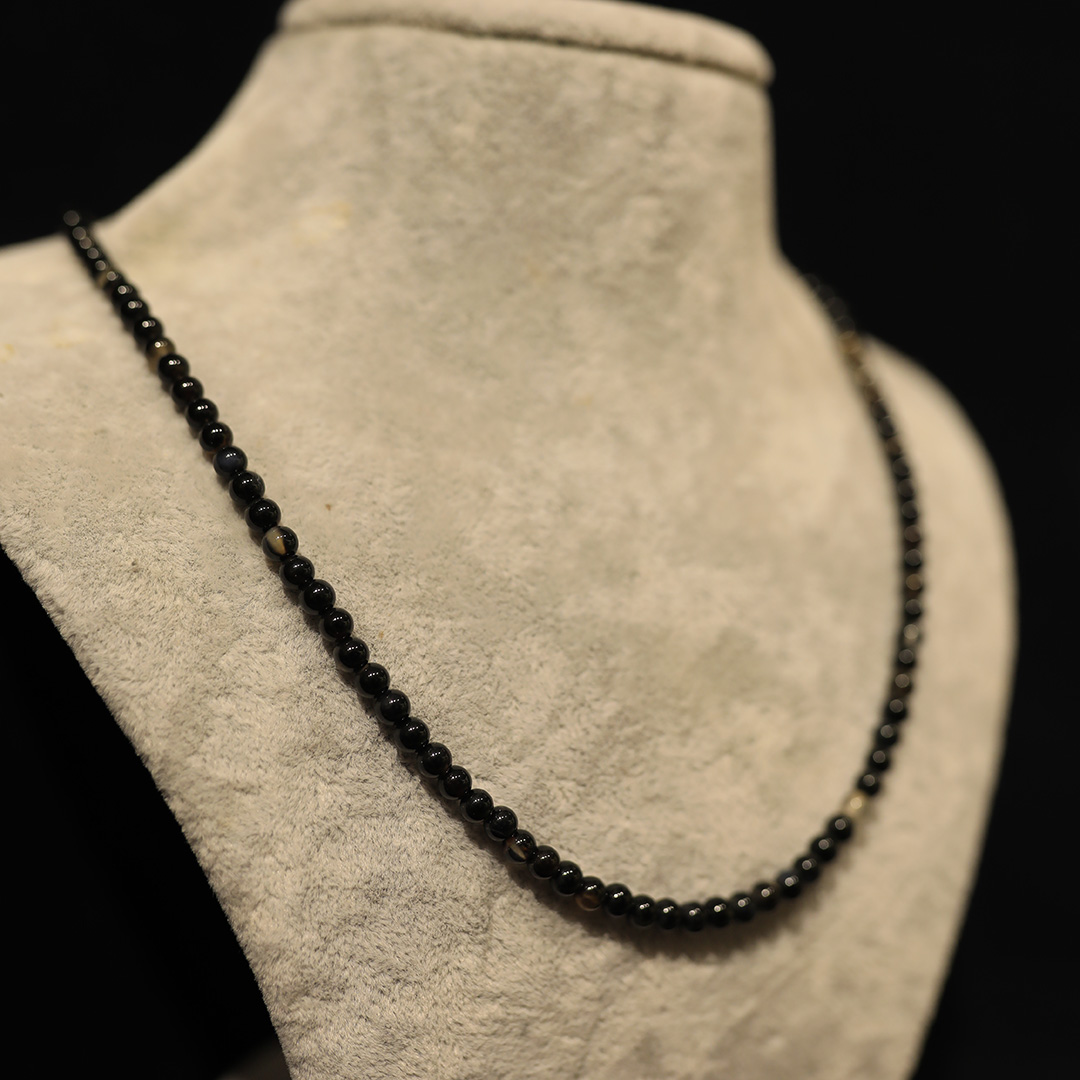 Asaletin ve gizemin simgesi olan siyah akik taşı, güçlü enerjisi ve zarif görünümüyle dikkat çeker. 🖤 4mm faset kesim taneleri, ışığı şık bir şekilde yansıtarak kolyeye hem modern hem de sofistike bir hava katar.