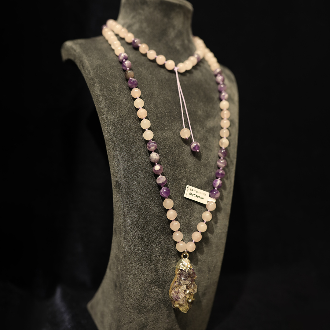 8mm ametist ve pembe kuvars taşlarının uyumu, iç huzurunuza giden yolu aydınlatıyor.