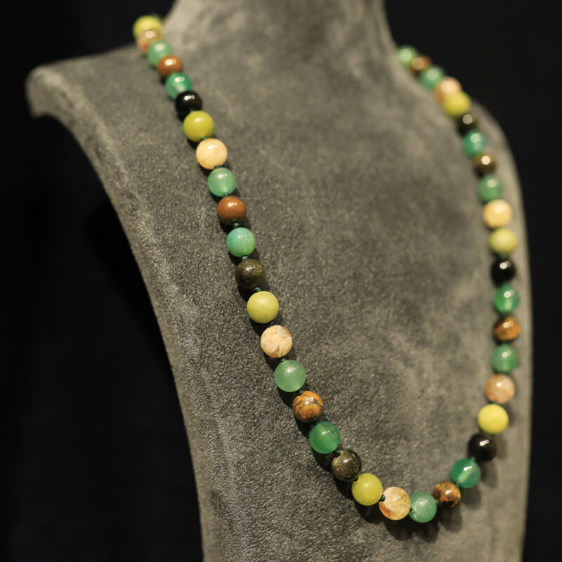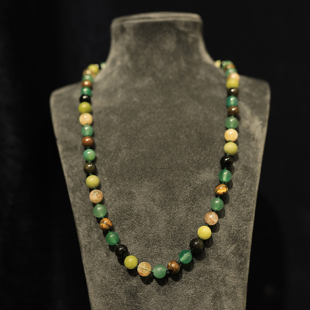 Kolye Obsidyen, Yeşil Akik, Kaplan Gözü, Aventurin, Sitrin, Yeşim Taşı t taşlarından oluşmaktadır.