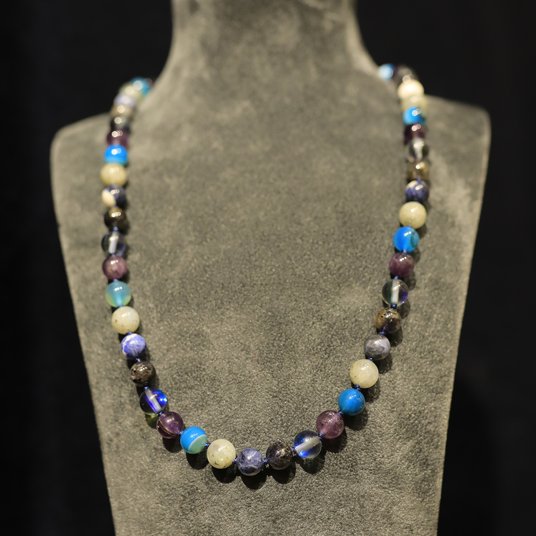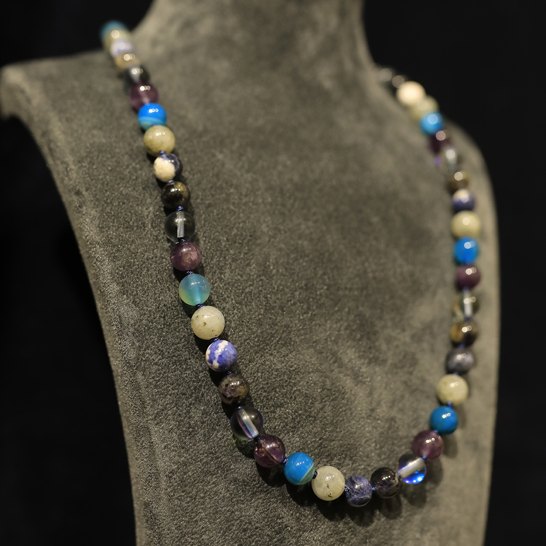 Kolye Ametist, Mavi Kuvars, İyolit, Sodalit, Labradorit, Mavi Akik taşlarından oluşmaktadır.