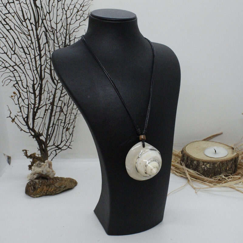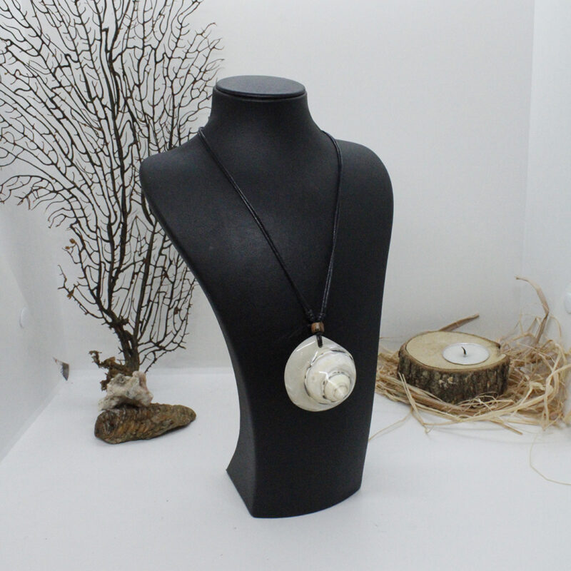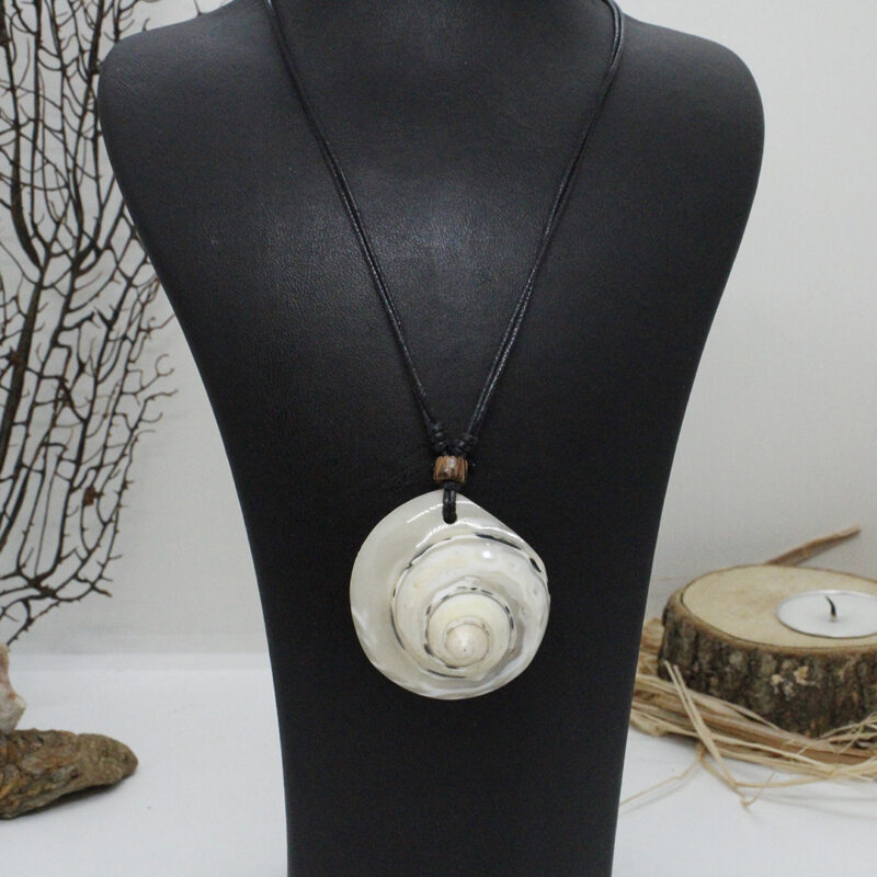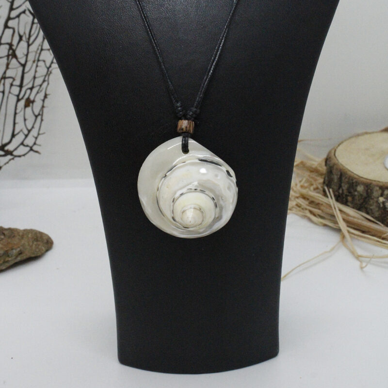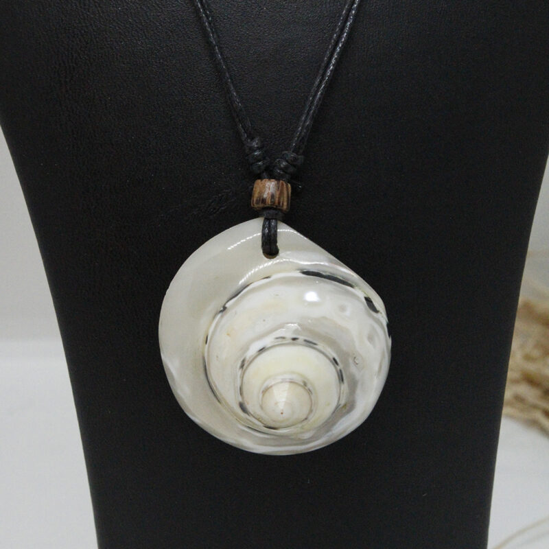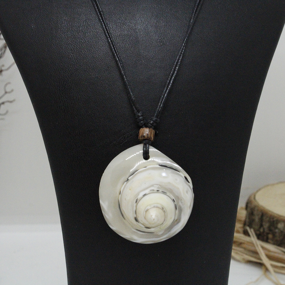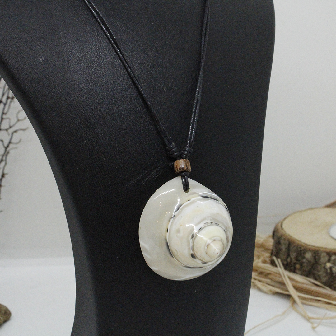 - Beyaz Turbo kabuklarından yapılmış özel bir tasarıma sahip kolye