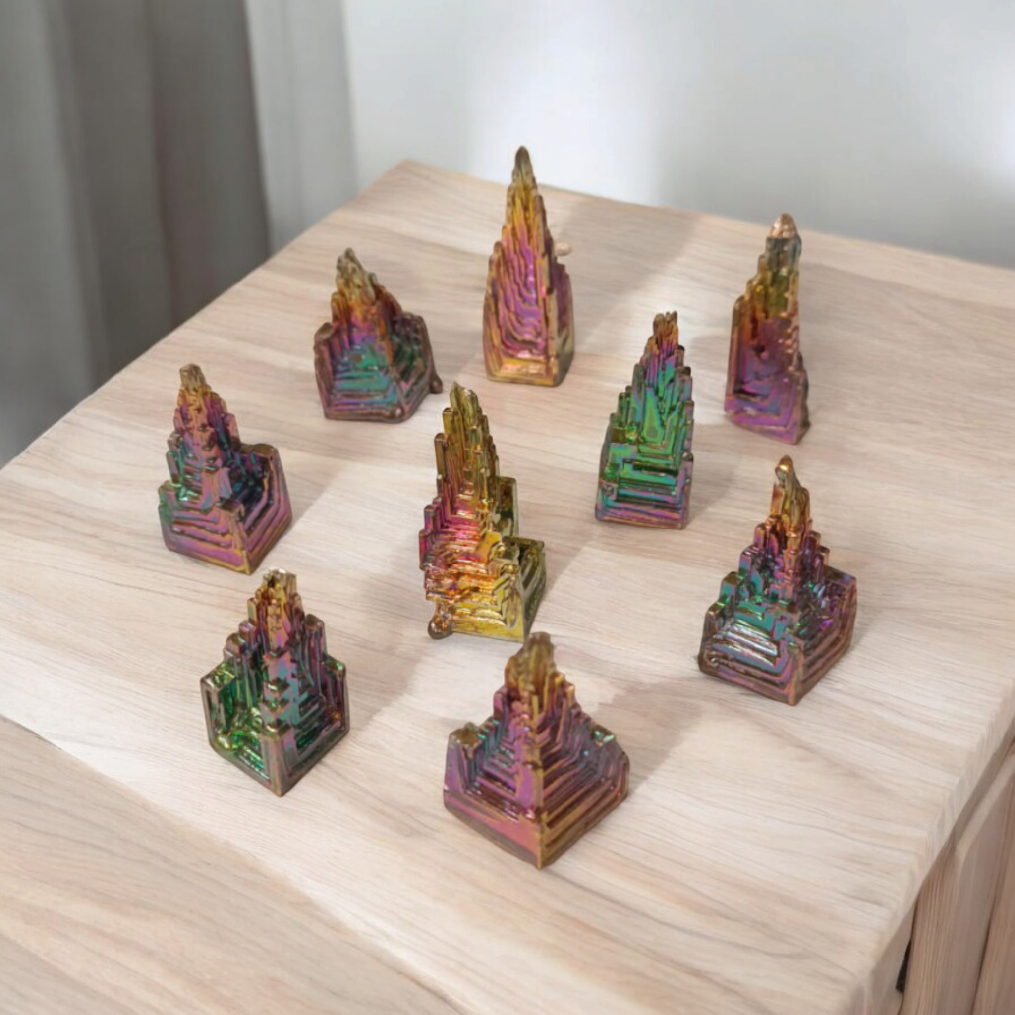 - Dekoratif Kristaller: Bizmutun oksitlenme sonrası oluşan renkli kristal yapıları, süs eşyası ve koleksiyon parçaları olarak popülerdir. Doğal gökkuşağı renkleri, metalin çekiciliğini artırır.